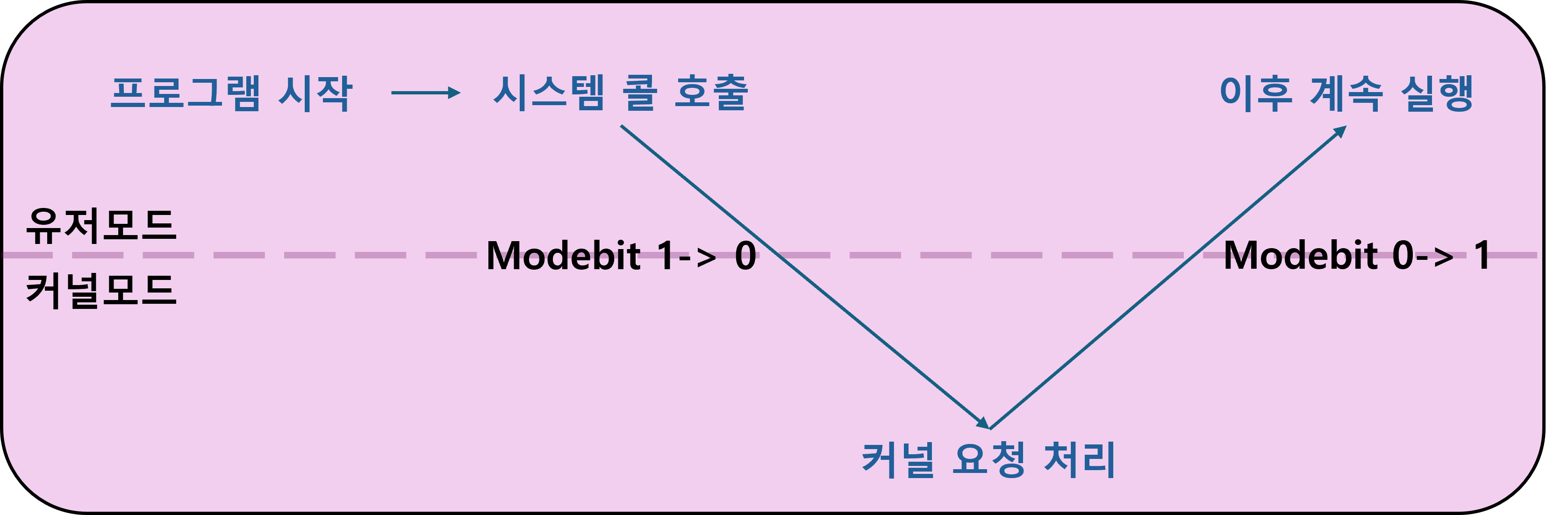 2) 프로그램이 시스템 콜을 호출하면, modebit 가 0으로 변경되어 커널 모드로 전환된다. 이때 커널은 요청을 처리하고 결과를 반환한다.
