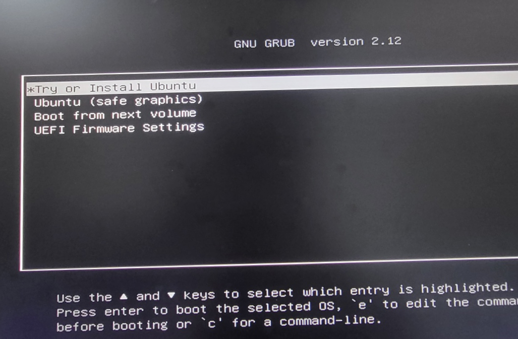 그리고 기억이 잘 나지는 않지만 USB ~ 라고 써있는 것을 클릭하면 아래와 같은 화면이 나온다. 이제 Try or Install Ubuntu를 선택하면 Ubuntu 설치가 시작된다.