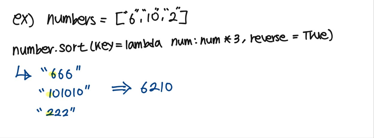 https://school.programmers.co.kr/learn/courses/30/lessons/42746 프로그래머스코드 중심의 개발자 채용. 스택 기반의 포지션 매칭. 프로그래머스의 개발자 맞춤형 프로필을 등록하고, 나와 기술 궁합이 잘 맞는 기업들을 매칭 받으세요.programmers.co.kr오늘은 정렬문제였다.lambda를 이용해서 정렬해준다. 여기서 알게된 점은 문자열을 sort 할때는 맨 앞 글자를 기준으로 한다는 것.def solution(numbers): numbers_str = [str(num) for num in numbers] numbers_str.sort(key=lambda num: num*3, reverse=True) ## 여기서 알게된것!! 문자열..